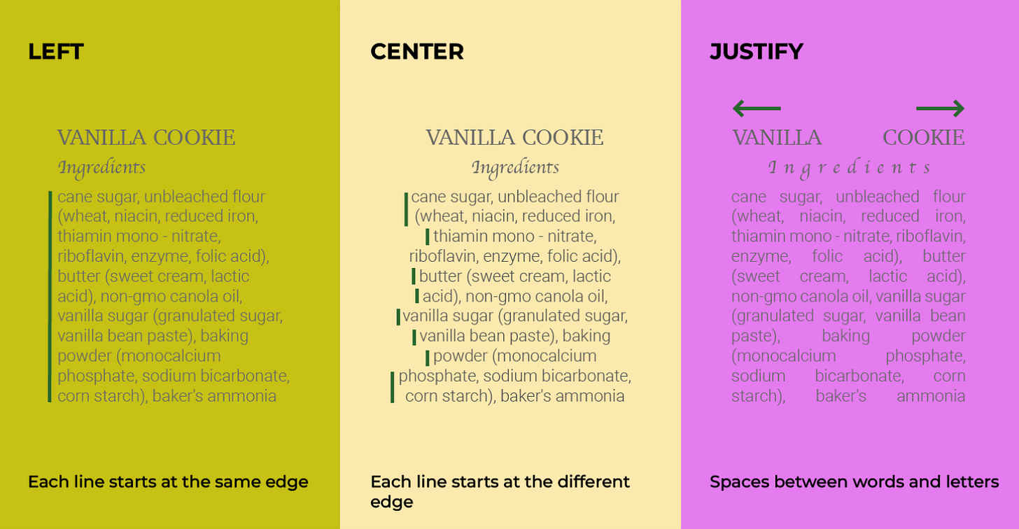 Use left-aligned type. This graphic is a perfect example of why. Unless you’re writing a book and are using programs with extra controls over how typography works, your flush type is going to look like a mouth with missing teeth. It’s awkward and clumsy, and, worse, it makes reading more difficult. With ragged-right type, keeping your place as you read is simple thanks to the visual cues held in the line length. (This is a huge debate in the legal field, as some lawyers find justified type serious and formal, while others find left-aligned text just as professional but easier to read.) If you must justify, turn on hyphenation!