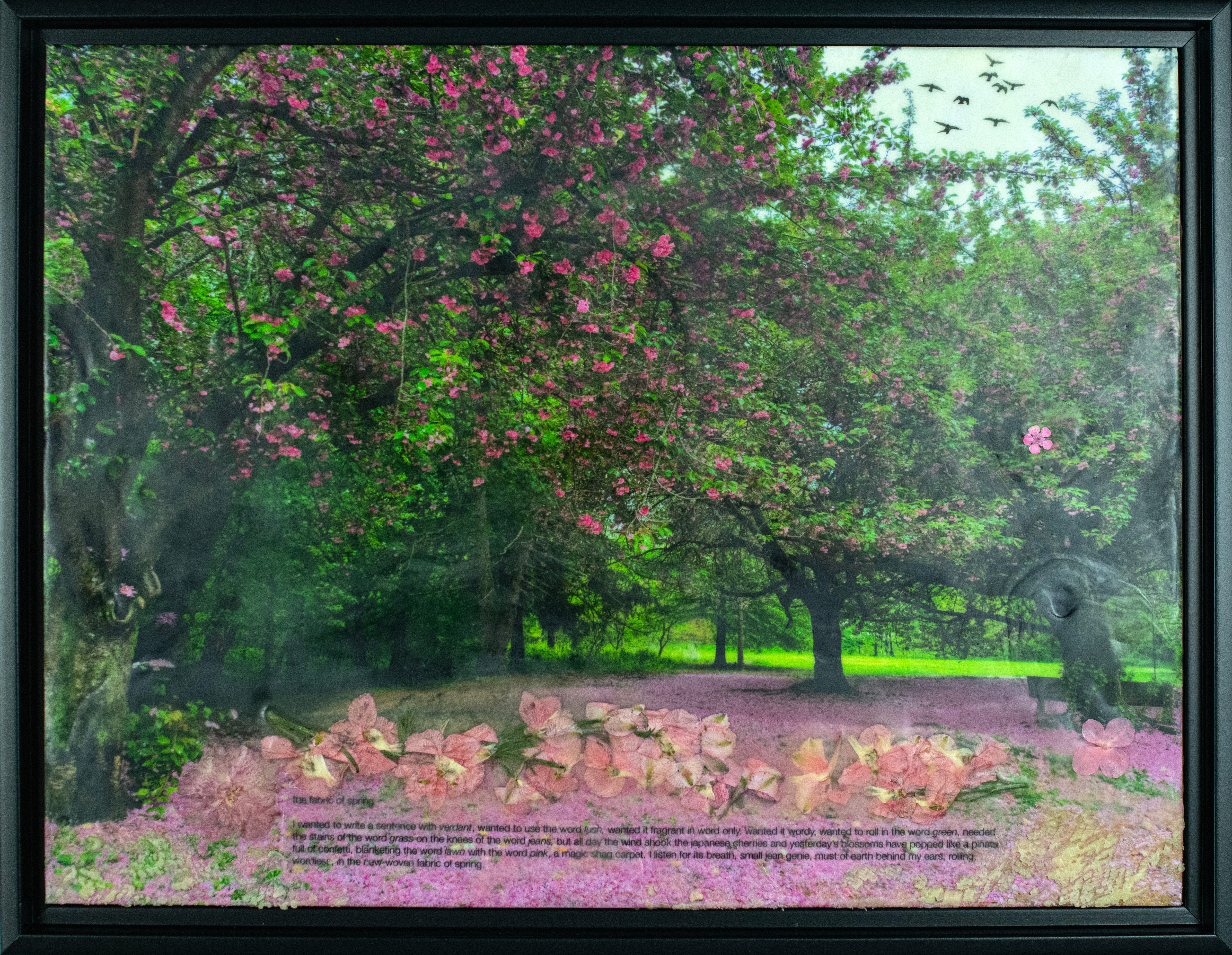 The fabric of spring I wanted to write a sentence with verdant, wanted to use the word lush, wanted it fragrant in word only. wanted it wordy, wanted to roll in the word green, needed the stains of the word grass on the knees of the word jeans, but all day the wind shook the japanese cherries and yesterday’s blossoms have popped like a piñatafull of confetti, blanketing the word lawn with the word pink, a magic shag carpet. I listen for its breath, small jean genie, must of earth behind my ears, rolling,wordless, in the new-woven fabric of spring.
